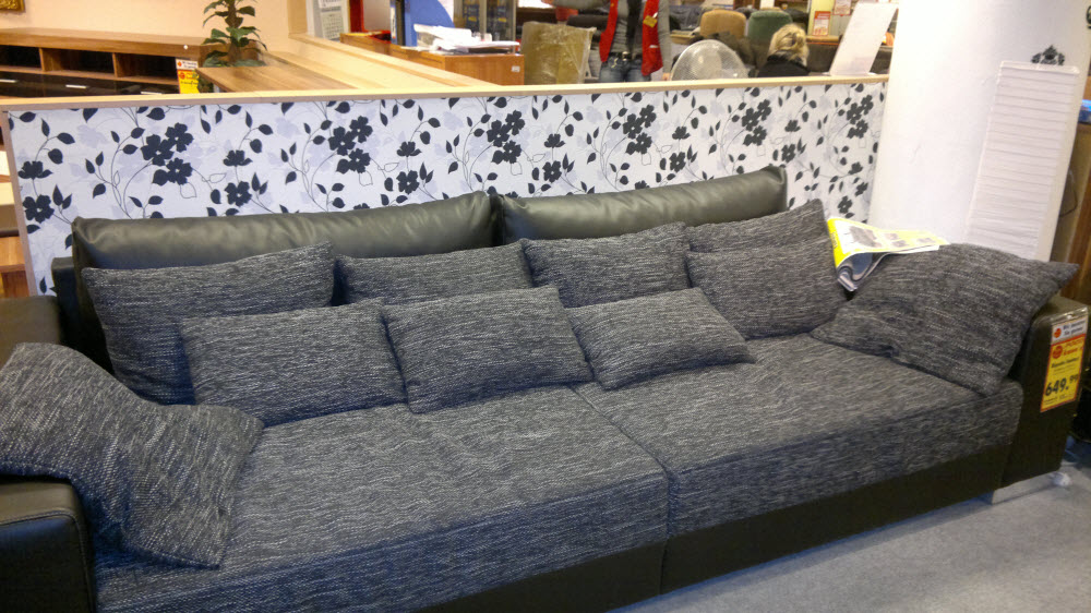 Весь день субботы прошатались по мебельному магазину - выбирали диван, обеденный стол и журнальный столик. В результате ни на чем не остановились - решили дома еще раз примерить все понравившиеся варианты. Вечером пошли на The Tourist (OV). Каким-то образом нам продали билеты на 31 января. Я дату не посмотрел, кассирша не посмотрела, билетер не посмотрела. Хороший фильм. Шикарная Анджелина Джоли и прикольный Джонни Депп. Ненапряжный английский. В общем вполне здорово, рекомендую. Вечером делали себе молочный коктейль из остатков продуктов. Затем стали примерять, как лучше расставить мебель. В результате пришли к выводу, что не нужен нам ни журнальный столик, ни обеденный стол, зато остановились на том диване каком хотели. Огромный - 3 метра длина, 1.6 метра ширина. С 12 подушками :) Примерно такой, но с немного другой обивкой: