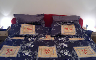 В это воскресенье было одно из немногих воскресений, когда магазины в Германии могут работать. Сначала мы поехали и заказали диван, потом поехали в другой магазин, купили немного посуды и всякой другой мелочи по дому. Дома я повесил очередную люстру. Один плафон не заработал, так что предстоит еще с ней повозиться :( Потом занялся готовкой курицы с карри и чили по этому рецепту. В общем сделал вкусно :) Пили дешевое, но вкусное вино из Македонии. А потом постелили новое одеяло с новым постельным бельем с ebay. Получилось вот что: